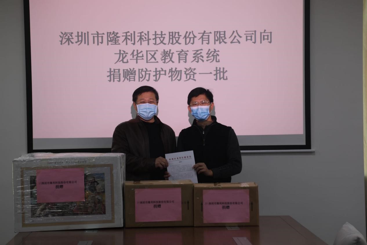 2020年2月17日,隆利科技向龍華區教育局捐贈防護物資一批,該批物資是由隆利科技吳總送達區教育局,并收到了龍華區教育局的感謝信。在疫情防控的特殊時(shí)期,隆利科技希望能送上一份溫暖,與龍華政府攜手共進(jìn),共克時(shí)艱。